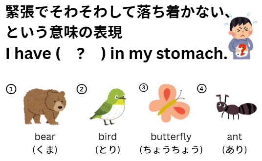 「I have butterflies in my stomach.」は、直訳すると「おなかにちょうちょがいる」という意味。