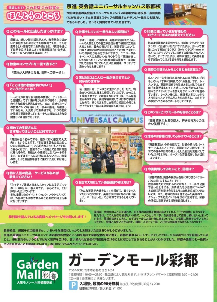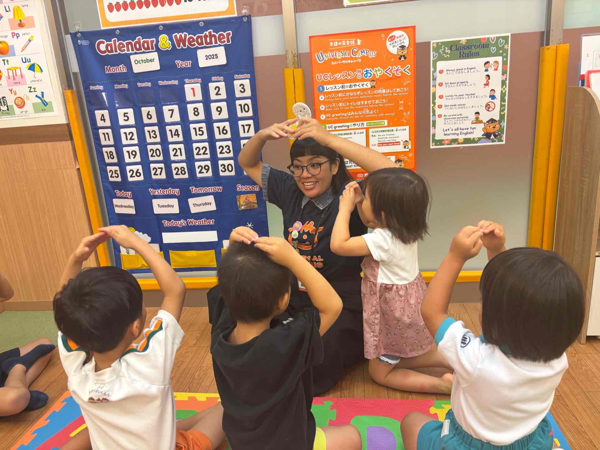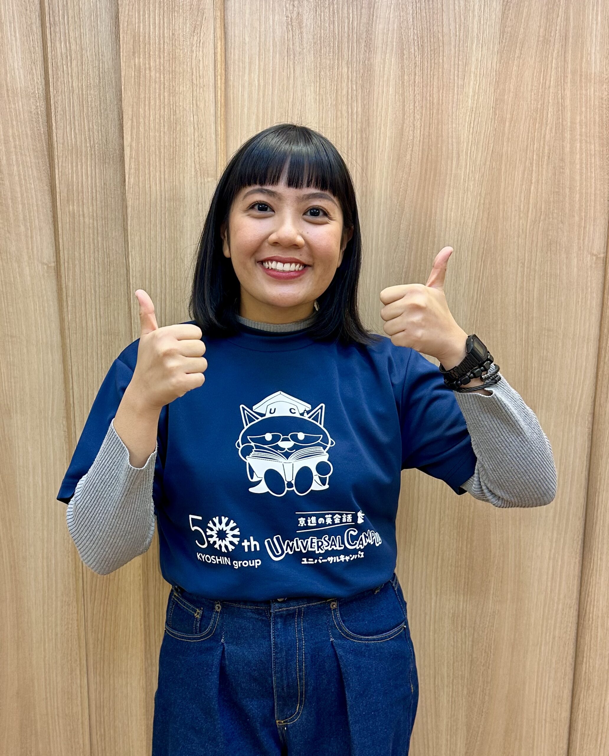 Hello everyone! こんにちは!ユニバーサルキャンパス彩都校のチーフティーチャー、アンジー先生です。フィリピンのマニラ出身です。生徒と遊んだり歌ったりするのが大好きです。私の目標は、生徒が英語を上手に話せるようになり、言語の素晴らしさを楽しめるように支援することです。See you at UC!