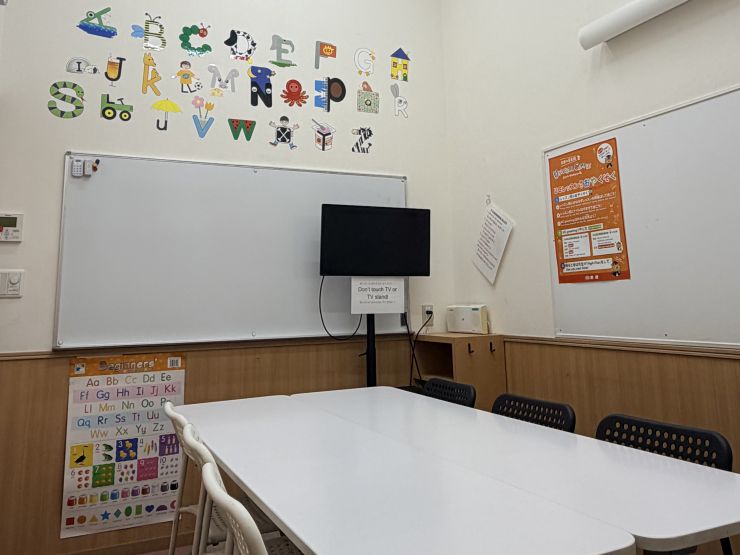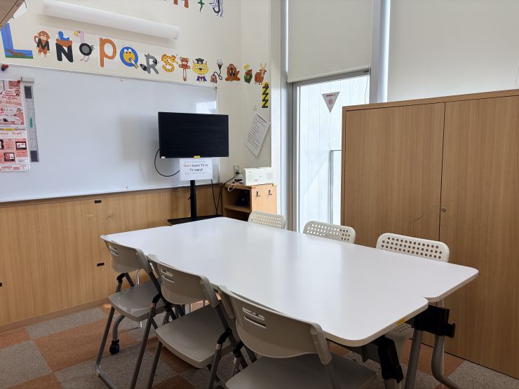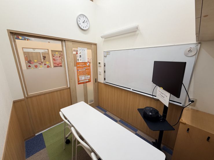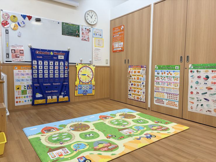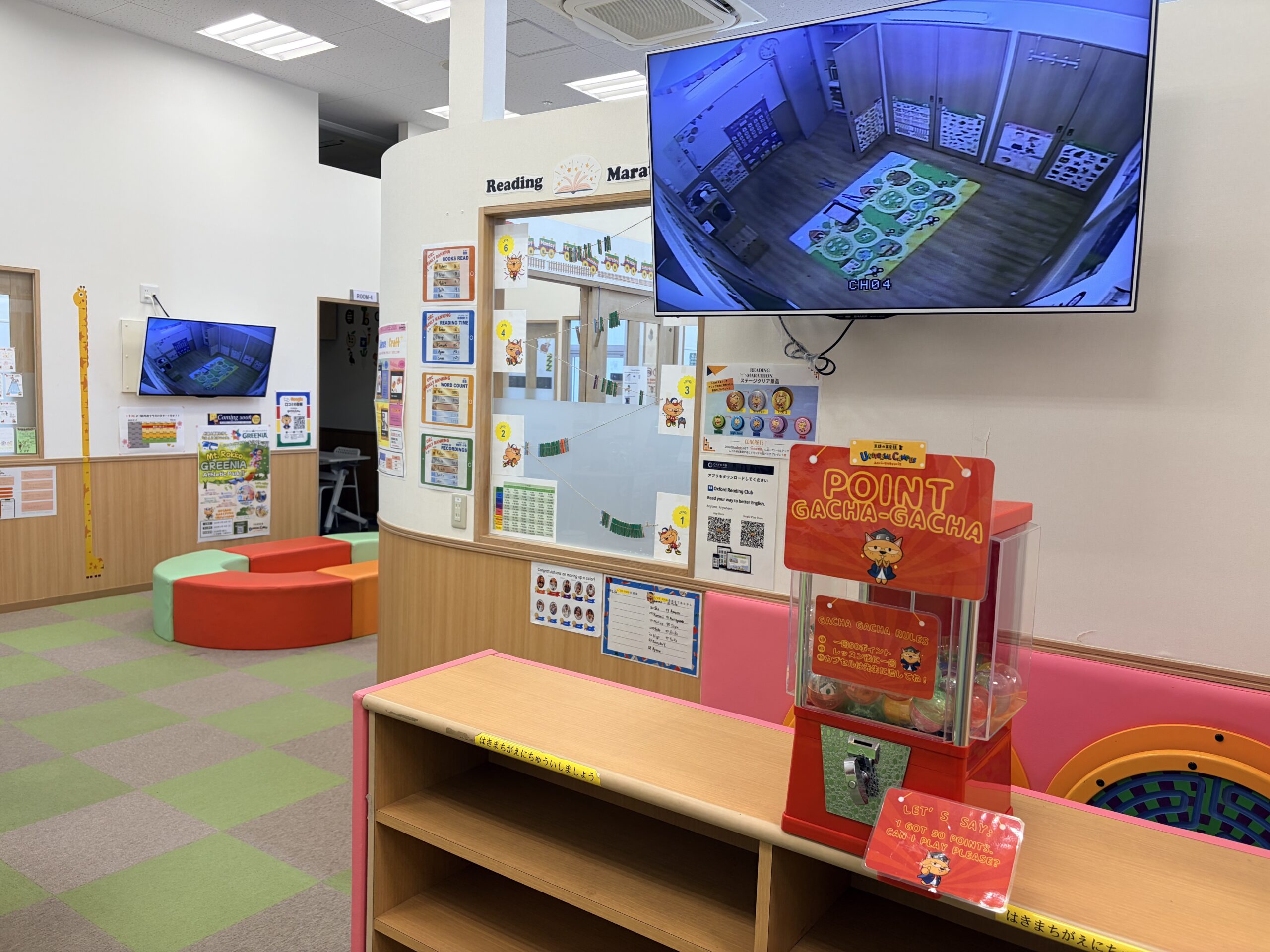 明るい校舎には、各教室を映し出すモニターを完備。待合スペースにいながら、お子様がイキイキと英語を話す姿をいつでも見守ることができます。「今日、頑張ってたね!」そんな親子の会話も弾みます。 - 忙しいパパ・ママの味方です